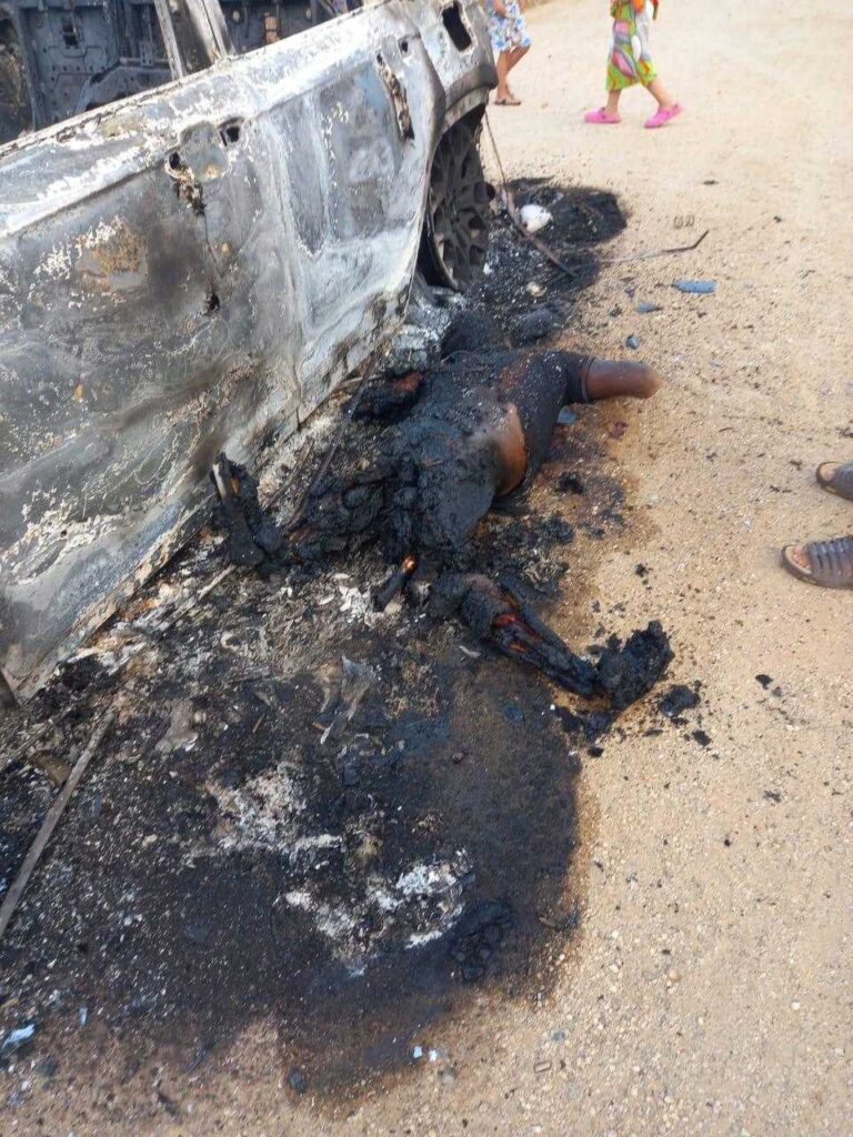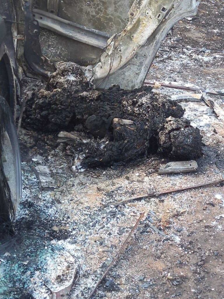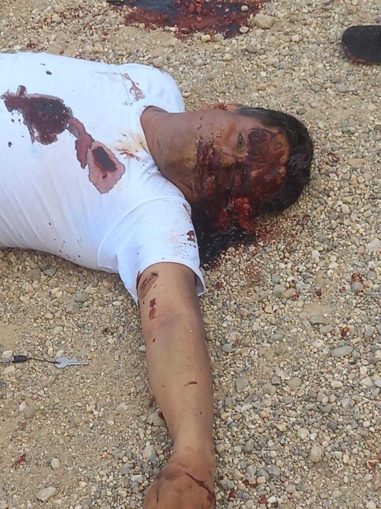 メキシコ チアパス州バリオサバル市で犯罪組織間の衝突が発生した後、焼け落ちたトラックの隣に 3 人の殺し屋が残された様子です。